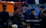 Penjabat (Pj) Gubernur DKI Jakarta Heru Budi Hartono menerima ucapan selamat saat menghadiri rapat paripurna DPRD DKI Jakarta di ruang Rapat Paripurna DPRD DKI Jakarta, Senin (17/10/2022). Pj Gubernur DKI Jakarta Heru Budi Hartono menghadiri rapat paripurna DPRD DKI Jakarta untuk pertama kalinya usai dilantik. Adapun agenda paripurna tersebut yaitu Penyampaian Laporan hasil pembahasan Bapemperda terhadap Raperda tentang pencabutan Peraturan Daerah Nomor 1 Tahun 2014 tentang Rencana Detail Tata Ruang dan Peraturan Zonasi.  (FOTO : Republika/Prayogi)