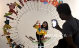 Pengunjung berfoto dengan karya saat Pameran Nandur Srawung ke-9 di Taman Budaya Yogyakarta, Senin (17/10/2022). Pameran Nandur Srawung ke-9 tahun ini mengusung tema Matrix/ Mayapada. Tema itu bermakna gagasan untuk melakukan pembacaan realita ganda antara fisik dan nonfisik. Lebih dari 240 partisipan yang terlibat dalam pameran ini. Selain diikuti seniman tanah air, pameran ini juga diikuti oleh seniman luar negeri diantaranya dari negara Rusia, Italia, Australia, dan Korea. (FOTO : Republika/Wihdan Hidayat)