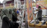Sejumlah santri melihat produk sepatu pada gelaran Expo dan Festival Santri Jawa Barat di Bale Asri Masjid Pusdai, Kota Bandung, Selasa (18/10/2022). Festival yang diikuti oleh santri dari berbagai pondok pesantren di Jawa Barat tersebut diisi dengan berbagai lomba serta pameran UMKM dan produk buatan pondok pesantren. Festival tersebut merupakan rangkaian dari peringatan Hari Santri yang jatuh pada 22 Oktober mendatang. Republika/Abdan Syakurase (FOTO : REPUBLIKA/ABDAN SYAKURA)