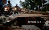 Pengendara melintas disamping proyek galian saluran di Pejaten, Pasar Minggu, Jakarta Selatan, Selasa (18/10/2022). Galian yang menghabiskan setengah badan jalan tersebut membuat arus lalu lintas tersendat, sehingga menyebabkan kemacetam akibat sejumlah kendaraan harus bergantian melintas di kawasan tersebut. (FOTO : Republika/Thoudy Badai)