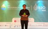 Penghargaan diserahkan oleh Head of Sustainability and Innovation Sectoral Group SwissCharm Indonesia, Christophe Piganiol kepada Direktur Indofood CBP, Taufik Wiraatmadja dalam Forum B20 Sustainability Award 4.0