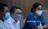 REPUBLIKA.CO.ID, YOGYAKARTA -- Koordinator Pelayanan Medis RSUP Dr Sardjito, Purjanto Tepo Utomo (kanan) memberikan paparan saat konferensi pers terkait penyakit gagal ginjal akut pada anak di RSUP Dr Sardjito, Yogyakarta, Rabu (19/10/2022).