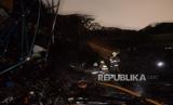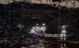 Petugas Damkar menggulung selang usai melakukan pendinginan pada kebakaran yang terjadi di Jakarta Islamic Center, Koja, Jakarta Utara, Rabu (19/10/2022). Sebanyak 21 unit mobil pemadam kebakaran dan 90 personel dikerahkan untuk memadamkan api. Kebakaran yang membakar bagian kubah masjid hingga roboh tersebut tidak menimbulkan korban jiwa. (FOTO : Republika/Putra M. Akbar)