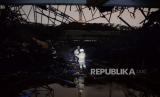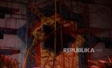 Petugas berusaha mengamankan barang berharga pasca kebakaran yang terjadi di Jakarta Islamic Center, Koja, Jakarta Utara, Rabu (19/10/2022). Sebanyak 21 unit mobil pemadam kebakaran dan 90 personel dikerahkan untuk memadamkan api. Kebakaran yang membakar bagian kubah masjid hingga roboh tersebut tidak menimbulkan korban jiwa. (FOTO : Republika/Putra M. Akbar)