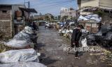 Pedagang melintas di antara tumpukan sampah di kawasan Pungkur, Kecamatan Regol, Kota Bandung, Kamis (20/10/2022). Penumpukan sampah tersebut akibat akses jalan menuju tempat pembuangan akhir (TPA) Sarimukti yang licin dan berlumpur sehingga menyebabkan operasional truk pengangkut sampah di kawasan Bandung Raya terganggu serta mengalami keterlambatan. (FOTO : REPUBLIKA/ABDAN SYAKURA)