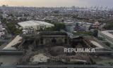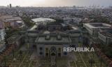 REPUBLIKA.CO.ID, JAKARTA -- Foto udara atap Masjid Jakarta Islamic Center (JIC) yang hancur pacakebakaran di Jakarta Utara, Kamis (20/10/2022). Kebakaran yang terjadi pada Rabu (19/10) masih dalam pemeriksaan Pusat Laboratorium Forensik Markas Besar Polri dan saat ini aktifitas ibadah dialihkan ke gedung JIC Convention Hall yang berada di sebelah bangunan utama Masjid.