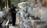 Petani memeriksa baglog jamur tiram usai panen di Metaram Jamur, Sribitan, Bantul, Yogyakarta, Jumat (21/10/2022). Setiap hari Daliman rata-rata bisa memanen jamur tiram sebanyak 10 kilogram untuk tiga ribu baglog jamur. Jamur biasanya dijual ke pedagang lagi dengan harga Rp 15 ribu perkilogram. Meski cuaca sedang tidak menentu, ini tidak memengaruhi hasil panen jamur tiram. (FOTO : Republika/Wihdan Hidayat)