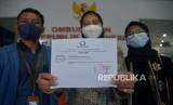 REPUBLIKA.CO.ID, JAKARTA -- Aktivis yang mengatasnamakan Koalisi Masyarakat Sipil Penyelamat Kemerdekaan Peradilan menunjukan tanda terima penyerahan laporan pengaduan di Kantor Ombudsman RI, Jakarta, Jumat (21/10/2022).