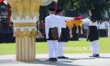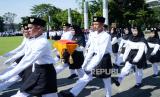 Pengibaran bendera merah putih oleh Paskibra santri saat Apel Peringatan Hari santri Tingkat Provinsi Jawa Barat Tahun 2022 di Bandung, Sabtu (22/10/2022). (FOTO : Edi Yusuf/Republika)