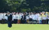 Gubernur Jawa Barat Ridwan Kamil menyampaikan sambutan saat Apel Peringatan Hari santri Tingkat Provinsi Jawa Barat Tahun 2022 bertajuk Berdaya Menjaga Martabat Kemanusiaan, di Lapangan Gasibu, Kota Bandung, Sabtu (22/10). Dalam sambutannya, Gubernur Jawa Barat menyampakan dengan hadirnya hari santri kita tidak melupakan bahwa tegaknya NKRI tidak lepas dari jasa dan pengorbanan para ulama dan santri (FOTO : Edi Yusuf/Republika)