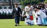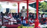 Gubernur Jawa Barat Ridwan Kamil menyapa para santri saat menghadiri Apel Peringatan Hari santri Tingkat Provinsi Jawa Barat Tahun 2022 bertajuk Berdaya Menjaga Martabat Kemanusiaan di Lapangan Gasibu, Kota Bandung, Sabtu (22/10/2022). (FOTO : Edi Yusuf/Republika)