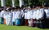 Ratusan santri dari pesantren di Jawa Barat menghadiri Apel Peringatan Hari santri Tingkat Provinsi Jawa Barat Tahun 2022 bertajuk Berdaya Menjaga Martabat Kemanusiaan di Lapangan Gasibu, Kota Bandung, Sabtu (22/10/2022). (FOTO : Edi Yusuf/Republika)