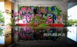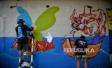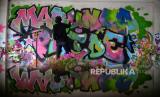 Seniman menyelesaikan pembuatan mural dalam acara Jakarta Thinkcity di Rusun Marunda, Jakarta, Sabtu (22/10/2022). Kegiatan pembuatan mural tersebut bertujuan untuk meningkatkan kesadaran publik akan isu perubahan iklim yang telah nyata terjadi di Ibu Kota khususnya wilayah Jakarta Utara. (FOTO : Republika/Thoudy Badai)