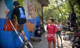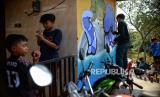 Warga menyaksikan seniman saat menyelesaikan pembuatan mural dalam acara Jakarta Thinkcity di kawasan pemukiman Marunda, Jakarta, Sabtu (22/10/2022). Kegiatan pembuatan mural tersebut bertujuan untuk meningkatkan kesadaran publik akan isu perubahan iklim yang telah nyata terjadi di Ibu Kota khususnya wilayah Jakarta Utara. (FOTO : Republika/Thoudy Badai)