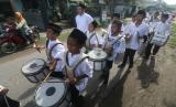 Sejumlah pelajar memainkan alat musik saat mengikuti pawai Hari Santri Nasional di Desa Tugurejo Kediri, Jawa Timur, Sabtu (22/10/2022). Pawai tersebut diikuti pelajar dari sejumlah sekolah tingkat TK hingga SD. (FOTO : ANTARA/Fauzan)