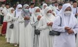 Sejumlah ustaz dan ustazah berdoa saat mengikuti upacara peringatan Hari Santri Nasional 2022 di halaman Kantor Gubernur Provinsi Kalimantan Tengah, Palangka Raya, Kalimantan Tengah, Sabtu (22/10/2022). Kegiatan tersebut diikuti ribuan santri dan pelajar dengan mengusung tema Berdaya Menjaga Martabat Kemanusiaan untuk menumbuhkan sikap moderat dan toleransi kalangan santri, umat Islam, dan seluruh bangsa. (FOTO : ANTARA/Makna Zaezar)