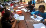 Anak-anak mengikuti melukis bersama saat Artcology River Culture di bawah Jembatan Wreksodiningrat, Sungai Code, Yogyakarta, Ahad (23/10/2022). Seniman dan anak-anak mengikuti kegiatan melukis bersama di tepian Sungai Code. Selain untuk mengenalkan seni lukis ke anak-anak, kegiatan ini mengajak untuk mencintai dan menjaga kelestarian sungai. (FOTO : Republika/Wihdan Hidayat)