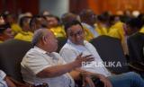 Mantan Gubernur DKI Jakarta Anies Baswedan berbincang dengan Koordinator Nasional Go-Anies Sirajuddin Abdul Wahab usai menerima rompi dalam acara Rakernas dan Ikrar Kebulatan Tekad Relawan Go-Anies di Jakarta, Ahad (23/10/2022). Go-Anies merupakan kelompok relawan yang mendeklarasikan untuk mendukung dan memenangkan Anies Baswedan menjadi Presiden pada pilpres 2024. Prayogi/Republika. (FOTO : Prayogi/Republika.)