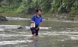 REPUBLIKA.CO.ID, JEMBRANA -- Warga menyeberangi sungai saat pulang menuju rumah di lingkungan Dauh Tukad, Desa Nusamara, Yehembang Kangin, Jembrana, Bali, Senin (24/10/2022). Sebanyak 21 kepala keluarga terisolir sejak November 2021 akibat jembatan gantung putus diterjang luapan air sungai.