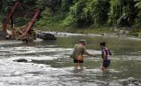 Warga menyeberangi sungai saat berangkat bekerja di lingkungan Dauh Tukad, Desa Nusamara, Yehembang Kangin, Jembrana, Bali, Senin (24/10/2022). Sebanyak 21 kepala keluarga terisolir sejak November 2021 akibat jembatan gantung putus diterjang luapan air sungai. (FOTO : ANTARA/Nyoman Hendra Wibowo)