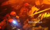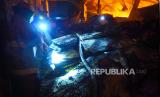 Petugas Damkar gabungan berusaha memadamkan gudang triplek yang terbakar di Jalan Soekarno-Hatta, Cijagra, Bandung, Jawa Barat, Selasa (25/10/2022). Kebakaran terjadi sejak Senin (24/10/2022) pukul 20.30 hingga 24 jam lebih kemudian kebakaran masih berlangsung. Tiga peleton pasukan damkar telah berusaha memadamkan api secara bergantian. (FOTO : Republika/Yogi Ardhi)