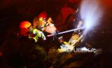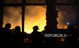 Siluet petugas Damkar gabungan berusaha memadamkan gudang triplek yang terbakar di Jalan Soekarno-Hatta, Cijagra, Bandung, Jawa Barat, Selasa (25/10/2022). Kebakaran terjadi sejak Senin (24/10/2022) pukul 20.30 hingga 24 jam lebih kemudian kebakaran masih berlangsung. Tiga peleton pasukan damkar telah berusaha memadamkan api secara bergantian. (FOTO : Republika/Yogi Ardhi)