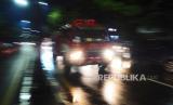 Truk Damkar melintasi jalanan saat berusaha memadamkan gudang triplek yang terbakar di Jalan Soekarno-Hatta, Cijagra, Bandung, Jawa Barat, Selasa (25/10/2022). Kebakaran terjadi sejak Senin (24/10/2022) pukul 20.30 hingga 24 jam lebih kemudian kebakaran masih berlangsung. Tiga peleton pasukan damkar telah berusaha memadamkan api secara bergantian. (FOTO : Republika/Yogi Ardhi)