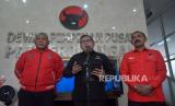 Sekjen PDI Perjuangan Hasto Kristiyanto (tengah) didampingi Ketua DPP bidang Kehormatan Komarudin Watubun (kiri) dan Ketua DPC PDIP Kota Solo FX Hadi Rudyanto (kanan) memberi keterangan pers usai pertemuan di Kantor DPP PDI Perjuangan, Jakarta, Rabu (26/10/2022). Bidang Kehormatan DPP PDI Perjuangan memberikan sanksi peringatan keras dan terakhir terhadap FX Hadi Rudyanto terkait dukungan terhadap Gubernur Jawa Tengah Ganjar Pranowo untuk maju pada Pilpres 2024. (FOTO : Republika/Prayogi)