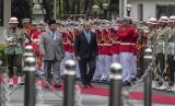 Menhan Prabowo Subianto (kiri) menerima kunjungan Perdana Menteri (PM) Palestina Mohammed Ibrahim Shtayyeh (kedua kiri) di halaman Kementerian Pertahanan, Jakarta, Rabu (26/10/2022). Pertemuan tersebut diselenggarakan dalam rangka meningkatkan hubungan keamanan kedua negara.  (FOTO : ANTARA/Muhammad Adimaja)