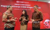 REPUBLIKA.CO.ID, JAKARTA -- Jajaran direksi CIMB Niaga menyampaikan Paparan Kinerja Q3 – 2022 PT Bank CIMB Niaga Tbk di Jakarta, Kamis (27/10/2022).