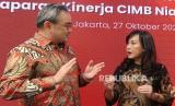 President Director CIMB Niaga Lani Darmawan (kanan) berbincang dengan Strategy Finance & SPAPM Director CIMB Niaga Lee Kai Kwong (kiri) disela acara Konferensi pers Paparan Kinerja Q3 – 2022 PT Bank CIMB Niaga Tbk di Jakarta, Kamis (27/10/2022). Disampaiakan bahwa CIMB Niaga perolehan laba sebelum pajak konsolidasi (unaudited) sebesar Rp5 triliun pada sembilan bulan pertama tahun 2022 (“9M22”), naik sebesar 22,5% year-on-year (YOY), dan menghasilkan earnings per share Rp154,13. Hasil positif tersebut, terutama dikarenakan adanya peningkatan pendapatan seiring dengan pertumbuhan bisnis yang baik, biaya yang terkendali, dan tren kualitas underlying asset yang lebih baik. Hal ini mendorong CIMB Niaga untuk terus memberikan nilai tambah kepada para shareholders. foto: darmaan/Republika (FOTO : REPUBLIKA/DARMAWAN)