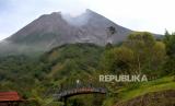 Pesepeda melihat visual Gunung Merapi di Klangon, Sleman, Yogyakarta, Kamis (27/10/2022). Hampir dua tahun status Gunung Merapi masih siaga atau sejak 5 November 2020. Sementara itu, tidak teramati perubahan signifikan kubah Barat Daya dan kubah Tengah. Untuk volume kubah lava barat daya sebesar 1,6 juta meter kubik dan kubah tengah sebesar 2,7 juta meter kubik. Potensi bahaya saat ini berupa guguran lava dan awan panas pada sektor Selatan dan Barat Daya. (FOTO : Republika/Wihdan Hidayat)