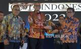 Wakil Menteri BUMN Pahala Nugraha Mansury memberikan piala Republika Anugerah Cinta Indonesia 2022 kepada perwakilan PT Telkom Indonesia Tbk disaksikan Pemimpin Redaksi Republika Irfan Junaidi di Jakarta, Kamis (27/10/2022). Acara Anugerah Cinta Indonesia 2022 ini merupakan bentuk apresiasi atas keseriusan kepada perusahaan dalam penerapan penggunaan produk dalam negeri. Prayogi/Republika. (FOTO : Republika/Prayogi)
