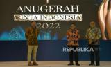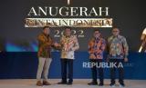 Wakil Menteri BUMN Pahala Nugraha Mansury memberikan piala Republika Anugerah Cinta Indonesia 2022 kepada perwakilan PT Aneka Tambang Tbk disaksikan Pemimpin Redaksi Republika Irfan Junaidi di Jakarta, Kamis (27/10/2022). Acara Anugerah Cinta Indonesia 2022 ini merupakan bentuk apresiasi atas keseriusan kepada perusahaan dalam penerapan penggunaan produk dalam negeri. Prayogi/Republika. (FOTO : Republika/Prayogi)