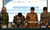 Ketua Umum Pimpinan Pusat Muhammadiyah KH Haedar Nashir (kedua kiri) bersama Rektor Universitas Muhammadiyah Prof Dr. Hamka (Uhamka) Gunawan Suryoputro (kedua kanan) menandatangani prasasti saat peresmian Masjid KH Hasyim sekaligus peluncuran buku berjudul Islam Syariat : Reproduksi Salafiyah Ideologis di Uhamka, Jakarta, Jumat (28/10/2022). Penerbit Suara Muhammadiyah  kembali meluncurkan buku karya Haedar Nashir yang dibuat tahun 2005 dari hasil disertasinya saat menempuh pendidikan di UGM. Selain itu, kehadiran ketua PP Muhammadiyah tersebut juga sekaligus meresmikan Masjid KH Hisyam, Klinik Pratama dan Lagu Sang Surya dalam Versi bahasa Jepang. Republika/Thoudy Badai (FOTO : Republika/Thoudy Badai)
