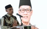 Ketua Umum Pimpinan Pusat Muhammadiyah KH Haedar Nashir menyampaikan sambutan saat peluncuran buku berjudul Islam Syariat : Reproduksi Salafiyah Ideologis di Universitas Muhammadiyah Prof Dr. Hamka (Uhamka), Jakarta, Jumat (28/10/2022). Penerbit Suara Muhammadiyah  kembali meluncurkan buku karya Haedar Nashir yang dibuat tahun 2005 dari hasil disertasinya saat menempuh pendidikan di UGM. Selain itu, kehadiran ketua PP Muhammadiyah tersebut juga sekaligus meresmikan Masjid KH Hisyam, Klinik Pratama dan Lagu Sang Surya dalam Versi bahasa Jepang. Republika/Thoudy Badai (FOTO : Republika/Thoudy Badai)