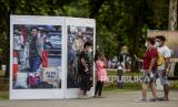 Pengunjung berfoto pada pameran foto jurnalistik bertajuk Rekam Jakarta 24+ di Taman Lapangan Banteng, Jakarta, Sabtu (29/10/2022). Pameran foto tersebut menampilkan 149 karya yang dihasilkan oleh 53 pameris dari Pewarta Foto Indonesia Jakarta yang berlangsung hingga 6 November 2022. Republika/Putra M. Akbar (FOTO : Republika/Putra M. Akbar)