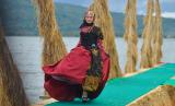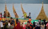 Model memperagakan busana batik pada Festival Galundi Singkarak di Nagari Batu Taba, Kabupaten Tanah Datar, Sumatera Barat, Sabtu (29/10/2022). Peragaan busana batik di atas Danau Singkarak tersebut untuk memperkenalkan batik khas desa itu dengan motif ikan bilih dan jariamun. (FOTO : ANTARA/Iggoy el Fitra)