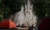 Sejumlah pengunjung berada di bawah tebing karst Sawapudo di Kecamatan Soropia, Konawe, Sulawesi Tenggara, Sabtu (29/10/2022). Tebing Sawapudo yang memiliki dinding batuan karst dengan tinggi sekitar 20 meter itu banyak dikunjungi wisatawan dan pecinta alam sebagai area panjat tebing.  (FOTO : ANTARA/jojon)