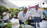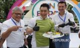 REPUBLIKA.CO.ID, JAKARTA -- Direktur Kepatuhan AXA Mandiri Rudy Kamdani dan Direktur Mandiri AXA General Insurance (MAGI) Laurent Bourson menunjukkan makanan sehat bersama Healthy Chef Edwin Lau dalam acara puncak Bulan Inklusi Keuangan (BIK) Otoritas Jasa Keuangan (OJK) di Mal Central Park, Jakarta, Sabtu (29/10/2022).