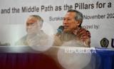Ketua Forum Perdamaian Dunia atau World Peace Forum (WPF) Din Syamsuddin (tengah), Anggota Pengarah Panitia (steering committee) Syafiq Mughni (kanan) bersama jajaran pengarah panitia lainnya menyampaikan keterangaan saat konferensi pers terkait penyelenggaran World Peace Forum di Gedung Dakwah PP Muhammadiyah, Jakarta, Senin (31/10/2022). World Peace Forum ke-8 akan digelar di Kota Solo, Jawa Tengah, pada 17-18 November 2022 mendatang. WPF kali ini mengangkat tema yang menonjolkan semangat persaudaraan kemanusiaan yakni Human Fraterniy and the Middle Path for Peceful, Just and Prosperous World yang akan dihadiri oleh sejumlah tokoh lintas agama di dunia. (FOTO : Republika/Thoudy Badai)