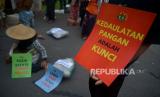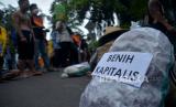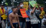 Sejumlah pengunjuk rasa yang tergabung dalam Serikat Petani Indonesia (SPI) melakukan aksi di depan Kantor Kementerian Pertanian, Jakarta, Senin (31/10/2022). Dalam aksinya mereka menuntut penolakan rencana pemerintah mengembangkan benih kedelai rekayasa genetik (GMO) yang diproduksi korporasi dan menuntut revisi Permentan 67/2016 sesuai dengan Putusan MK Nomor 87/PUU-XI/2013 serta mengkritisi program food estate. (FOTO : Republika/Prayogi)