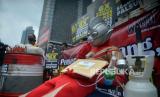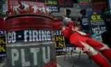 Sejumlah aktivis lingkungan hidup Walhi melakukan aksi di depan Kantor Kedutaan Besar Jepang, Jakarta, Selasa (1/11/2022). Mereka menyampaikan protes terhadap pemerintah Jepang terkait Strategi GX (Green Transformation) yang dinilai solusi palsu terhadap transisi energi, Karena co-firing PLTU dan penggunaan LNG sama saja dengan memperpajang umur penggunaan bahan bakar fosil dan akan mempeparah krisis iklim serta polusi udara. Prayogi/Republika. (FOTO : Republika/Prayogi)