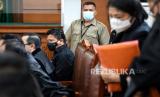 Terdakwa kasus dugaan pembunuhan berencana terhadap Brigadir Nofriansyah Yosua Hutabarat alias Brigadir J, Ferdy Sambo (tengah) dan istrinya Putri Candrawathi (kanan) saat dihadirkan secara bersama dalam sidang lanjutan di Pengadilan Negeri Jakarta Selatan, Jakarta, Selasa (1/11/2022). Sidang tersebut beragendakan mendengarkan pemeriksaan sejumlah saksi. Jaksa penuntut umum (JPU) menghadirkan sebanyak 12 saksi dari keluarga Brigadir yakni Samuel Hutabarat, Rosti Simanjuntak, Mahareza Rizky, Yuni Artika hutabarat, Devianita Hutabarat, Novitasari Nadea, Rohani Simanjuntak, Sanggah Parulian, Rosline Emika Simanjuntak, Indrawanto Pasaribu, pengacara keluarga Kamarudin Simanjuntak dan kekasihnya Brigadir J Vera Mareta Simanjuntak. Republika/Thoudy Badai (FOTO : Republika/Thoudy Badai)