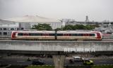 Rangkaian kereta LRT melintas di kawasan Rawamangun, Jakarta, Selasa (1/11/2022). PJ Gubernur DKI Jakarta Heru Budi Hartono mengatakan pada tahun 2023 tidak akan ada pembangunan lanjutan dari LRT Jakarta fase 2 rute Jakarta Internasional Stadium (JIS). Republika/Putra M. Akbar (FOTO : Republika/Putra M. Akbar)