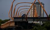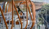 Pekerja menyelesaikan pembangunan jembatan penyeberangan orang (skywalk) di kawasan Kebayoran Lama, Jakarta, Rabu (2/11/2022). Proyek pembangunan skywalk sepanjang 500 meter dengan desain, cahaya artistik dan dilengkapi dengan fasilitas lift serta eskalator itu nantinya mengintegrasikan Stasiun Kebayoran dengan Halte Transjakarta Koridor 8 dan 13, yang ditargetkan selesai pada November 2022. (FOTO : Republika/Putra M. Akbar)