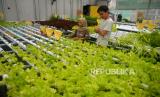 Petani milenial Ardan (kanan) dibantu pegawai memanen sayuran hidroponik di Dewa Ponik, Yogyakarta, Rabu (2/11/2022). Tidak tersedianya lahan tidak menjadi halangan untuk memulai usaha budidaya sayuran secara hidroponik. Hasil budidaya sayuran hidroponik memasok ke restoran, toko sayur, dan supermarket. Selain itu, kebun hidroponik juga menjadi sarana edukasi bagi pelajar dan masyarakat. (FOTO : Republika/Wihdan Hidayat)