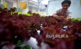 Petani milenial Ardan memanen sayuran hidroponik di Dewa Ponik, Yogyakarta, Rabu (2/11/2022). Tidak tersedianya lahan tidak menjadi halangan untuk memulai usaha budidaya sayuran secara hidroponik. Hasil budidaya sayuran hidroponik memasok ke restoran, toko sayur, dan supermarket. Selain itu, kebun hidroponik juga menjadi sarana edukasi bagi pelajar dan masyarakat. (FOTO : Republika/Wihdan Hidayat)