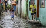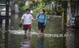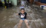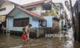 Anak-anak bermain air saat banjir di Gang Langgar, Petogogan, Kebayoran Baru, Jakarta, Senin (7/11/2022). Banjir di kawasan pemukiman warga setinggi 30 sentimeter tersebut diakibatkan hujan deras yang mengguyur Jakarta sehingga membuat aliran air Kali Krukut meluap. Republika/Putra M. Akbar (FOTO : Republika/Putra M. Akbar)
