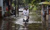 Pengendara motor melewati banjir di Gang Langgar, Petogogan, Kebayoran Baru, Jakarta, Senin (7/11/2022). Banjir di kawasan pemukiman warga setinggi 30 sentimeter tersebut diakibatkan hujan deras yang mengguyur Jakarta sehingga membuat aliran air Kali Krukut meluap. Republika/Putra M. Akbar (FOTO : Republika/Putra M. Akbar)